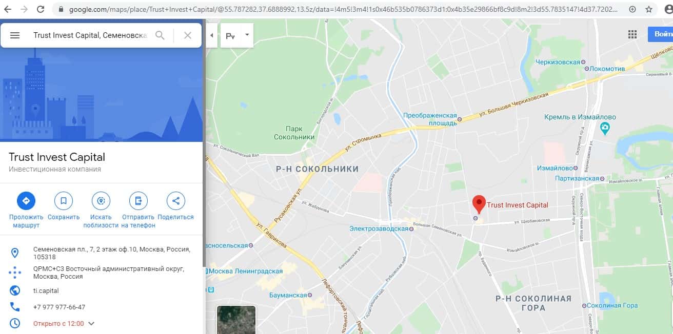 Так как мошенники не хотят выходить со своими обманутыми вкладчиками на прямой контакт. Пришлось провести ряд манипуляций с помощью которых удалось найти адрес их подвальной и лживой кухни. Месторасположения лохотроншиков Траст Инвест Капитал которые удалось найти с помощи google com: