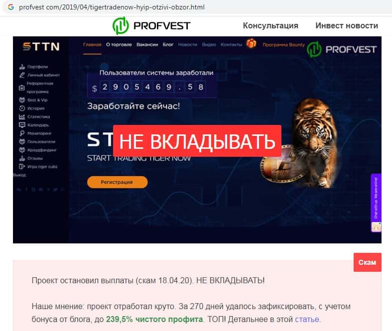 Независимые эксперты делали обзор псевдо брокера Тигр Трейд Нов и оказалось, что аферисты с 18.04.2020 прекратили всякие выплаты вкладчикам.
