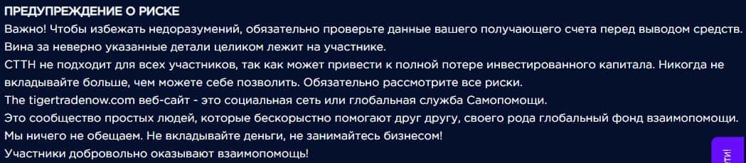 Тигр Трейд Нов - это чистой воды финансовая пирамида! Как заявляют сами же разводилы, их контора - это глобальная служба самопомощи. Жулики перестраховываются и не дают обещаний прибыли. Тигр Трейд Нов связаны с мошенническими конторами Вinance, Вinomo и ОlympTrade. Участники добровольно оказывают взаимную помощь - вот девиз очередной пирамиды-лохотрона!