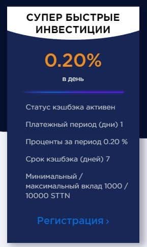 Второй тип счета - "Быстрые инвестиции". Лоховоды предлагают вкладчикам следующие условия - 0,25% ставка и минимальный вклад 10 000 STTN.