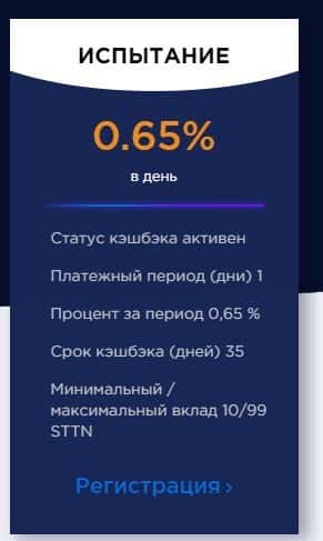 Следующий счет у псевдо брокера - это "Испытание". Тут следующие условия: 0,65% ставки и минимальный вклад 10 STTN.