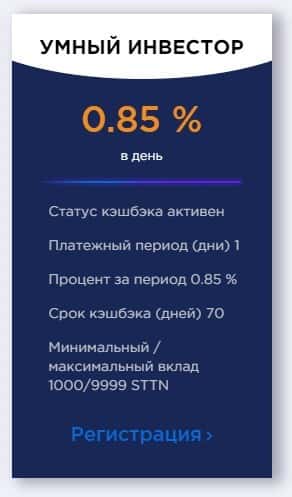 Пятый тип счета в финансовой пирамиде Тигр Трейд Нов - это "Умный инвестор". Жулики предлагают трейдерам минимальный вклад 1000 STTN и 0,85% ставку.