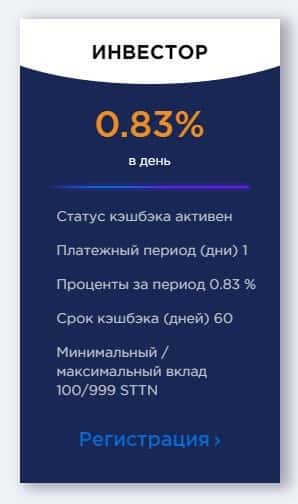 Четвертый разновидность счета - это "Инвестор". Трейдерам предлагают следующие условия: 0,83% ставка и минимальный вклад 100 STTN