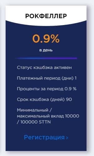 И последний тип счета, который шарлатаны предлагают трейдерам - это "Рокфеллер". Для пользователей тут следующие условия:0,9% ставка и минимальный вклад 10 000 STTN.