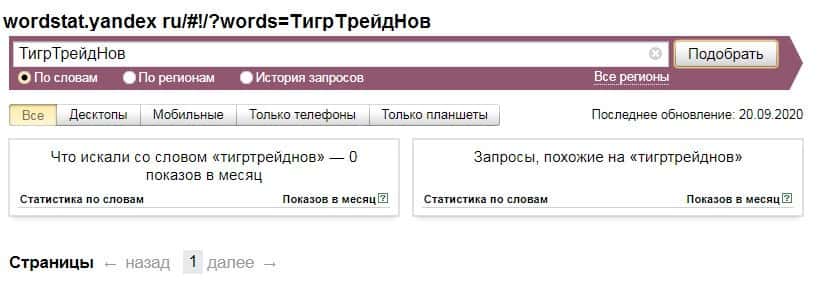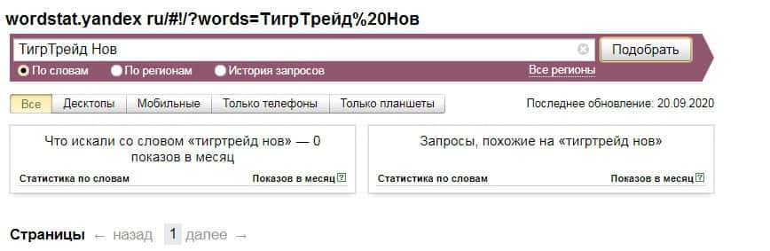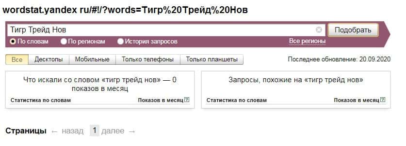 Следующий запрос в Яндекс на русском языке с одним пробелом "Тигр Трейд Нов", результат аналогичный предыдущему - 0 показов в месяц.