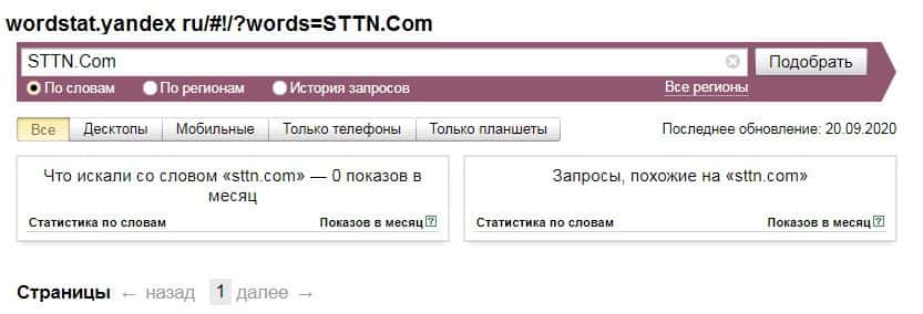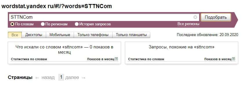 Третий запрос в Яндексе на английском языке без пробела "STTNCom", поисковик снова выдает результат - 0 показов в месяц.