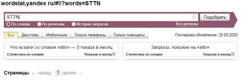Для начала рассмотрим запросы в Яндексе на английском языке. Первый запрос будет "STTN", поисковик выдает результат - 3 показа в месяц.