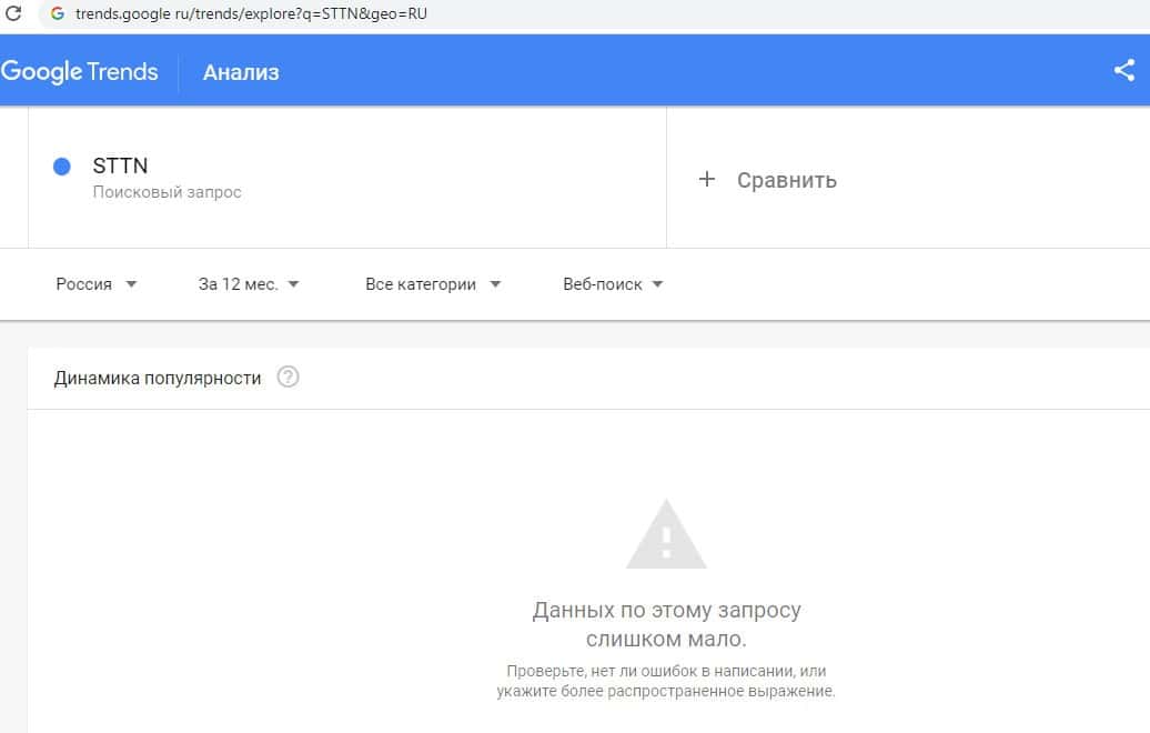 Теперь рассмотрим запросы в Google на английском языке. Первый запрос будет "STTN", поисковик выдал результат - 0 показа в месяц.