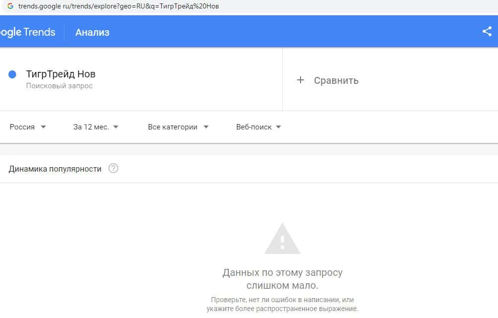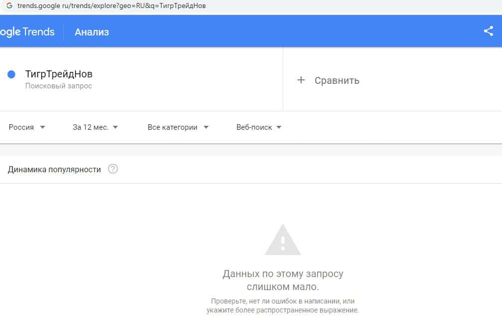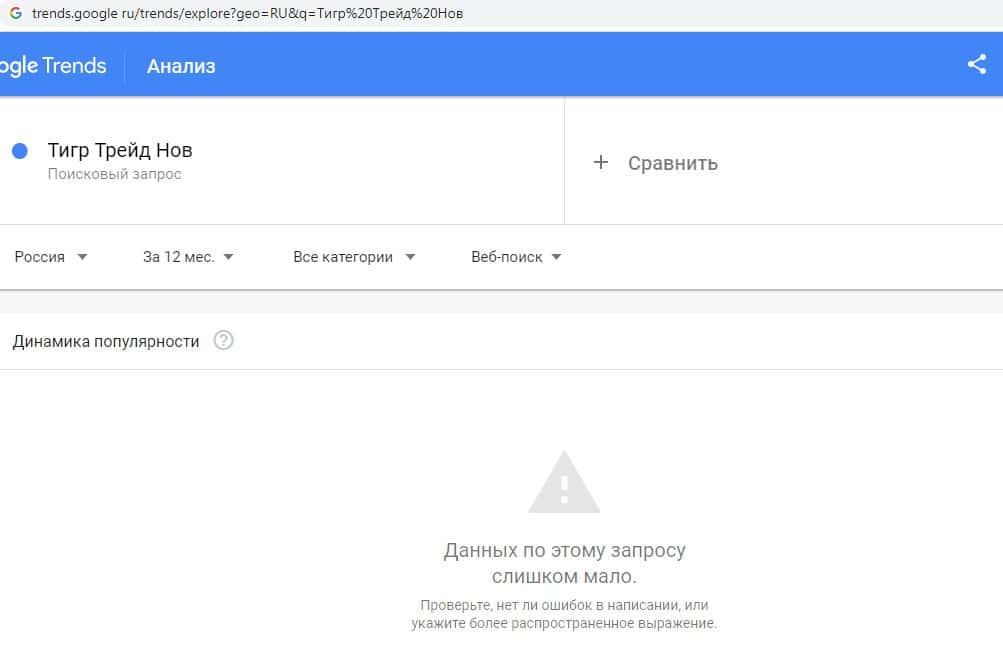 Последний запрос в Google на русском языке без пробелов "ТигрТрейдНов", результат не изменился, все так же 0 показов в месяц. Так жуликов никто не искал.