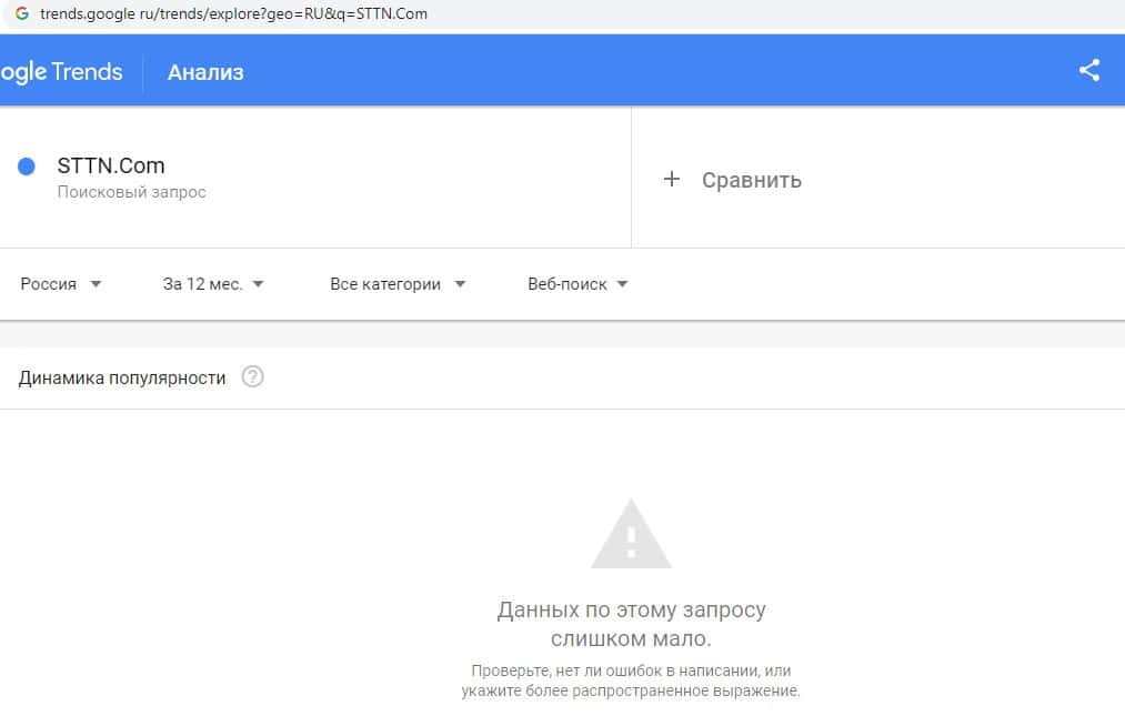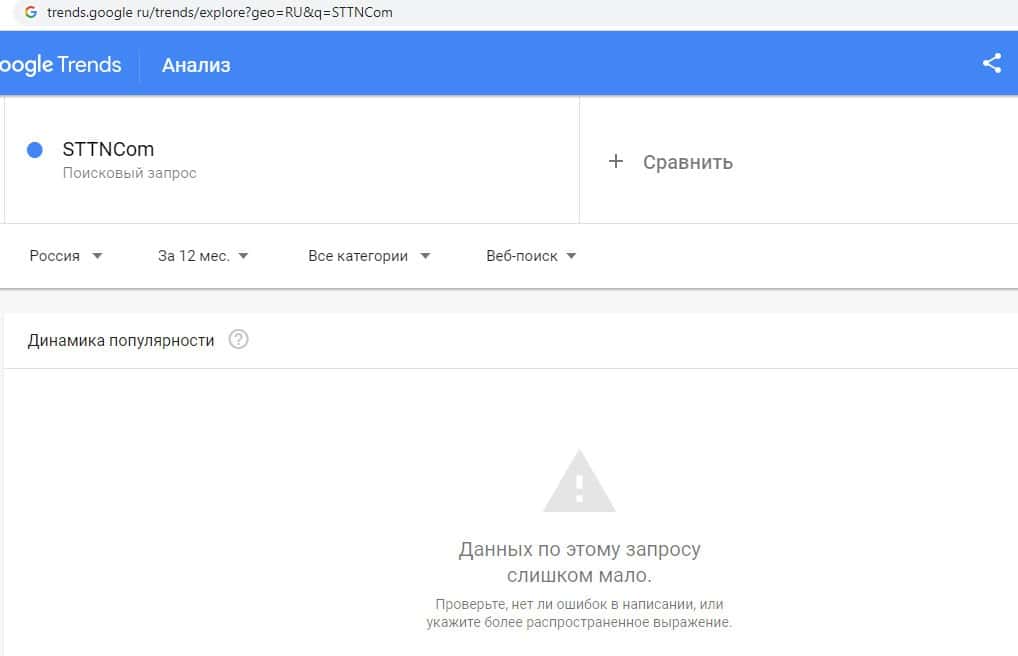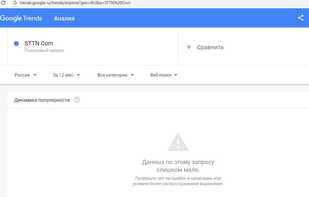Второй запрос в Google на английском языке с пробелом "STTN Com", поисковик выдал нам результат - 0 просмотров в месяц. Таким образом пользователи шарагу не искали.