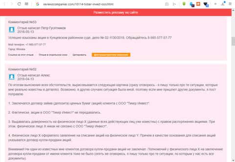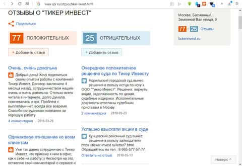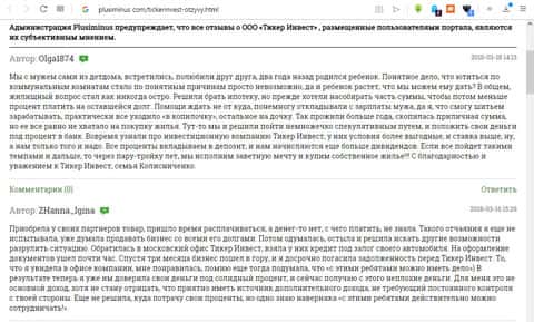 На форуме reviewscompanies, на котором идут бурные обсуждения насчет всяких лохотронах-мошенников, обворовавшие почти половину населения планеты, и, разбогатевшие на чужом горе. На данном портале в основном склоняется к тому, что отдав свои последние деньги Тикер Инвесту, вы сделаете неправильный выбор и получите такую невыгоду от ваших вложений, что вам и в снах не снилось.Сайт-форум plusiminus наполнен множеством ботов, защищаюших TickerInvest от критики яростных пользователей