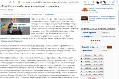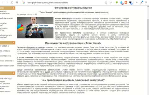 На сайте finanso net, посвященному финансовому направлению, их анализам и торговлям, связанных с последними, присутствует положительный отзыв мошшенической конторы Тикер Инвест, который был явно проплачен. Там говорится о полной безопасности и надежности работы с данной конторой инвестирования, о многофункциональном сервисе, который был протестирован специалистами.Отзывы о работе дилингового центра ТикерИнвест