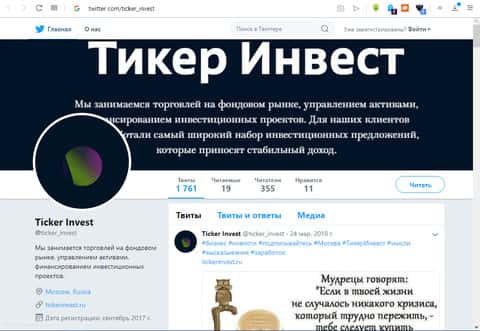 У данной шайки афферистов имеется группа в социальной сети, разработанной знаменитым Марком Цукербергом, насчитывающей 6 миллионов пользователей, Facebook. На стене данной группы присутствует всего лишь несколько записи, которые просто ссылаются на другие статьи, и имеют дату написания - 2018 год. То есть данной группой не занимались уже порядком почти два года, что говорит о некомпитентности.Пиар компании TickerInvest через социальную сеть Twitter