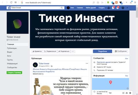 Эта шайка жуликов создала группа, находящуюся в социальной сети Вконтакте. Весь контент о инвестициях, о торгах просто копируется со страницы с Facebook, или наоборот. Последняя запись - 2017 год. Там же указана страница предводителя разбойников, на которой появляется активность, но довольно редко. Это может говорить о том, что группы ТикерИнвест просто забросили.