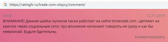 На сайте ratingfx ru обнаружен пользовательский отзыв о скам-брокере TimaTrade, которые завлекают пользователей на свой жульнический сайт через социальные сети. Будьте осторожны, не связывайтесь с мошенниками Тима Трейд !!!