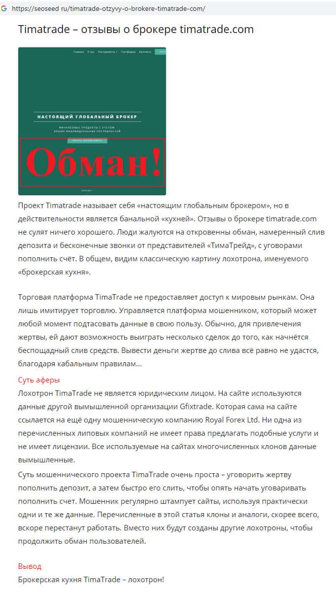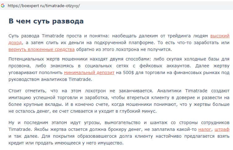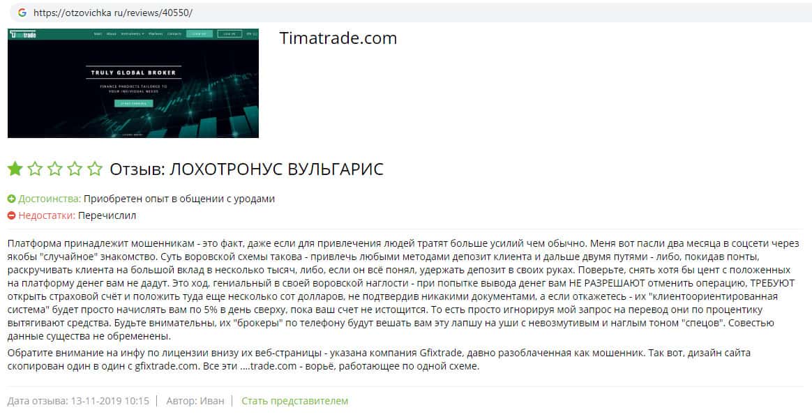На веб-площадке otzovichka ru обнаружена информация о том, что скам-контора TimaTrade выдает себя за лидера в сфере брокерских услуг, но на самом деле таким не является, потому что в глобальной сети интернет достаточно пользовательских отзывов, которые написаны людьми, которые связались с брокером Тима Трейд и остались в итоге ни с чем.