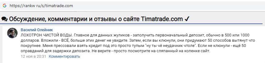 На сайте-отзовике rankw ru найден комментарий о шуллерах Тима Трейд, главной задачей которых является заполучение первоначального депозита клиента. Не ведитесь на уловки мошеннической организации TimaTrade и не регистрируйтесь на их сайте, не оплачивайте страховку. Вернуть свои денежные средства с сайта TimaTrade невозможно !!!