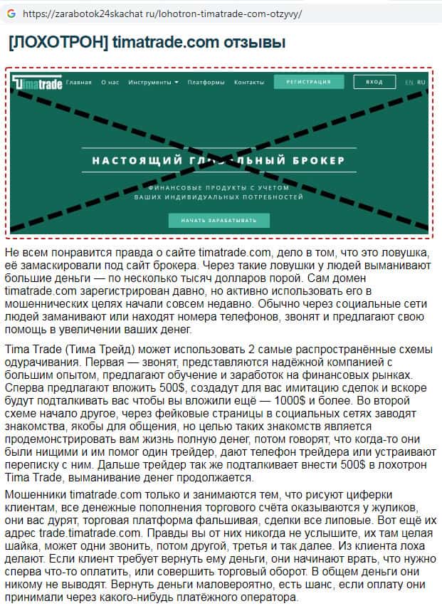 На веб-площадке zarabotok24skachat ru найдена статья об мошеннической организации Тима Трейд. Данная статья-отзыв очередное подтверждение тому, что компания TimaTrade - стандартный интернет-лохотрон, который создан для того, чтобы разводить люден на немалые суммы денежных средств.