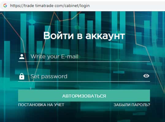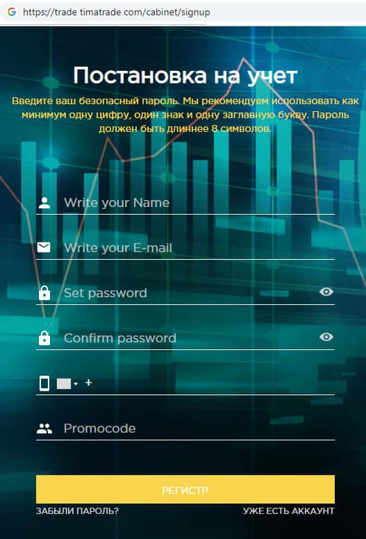 Для того, чтобы зарегистрироваться на сайте мошенников Тима Трейд необходимо назвать свое имя, адрес электронной почты и конечно же пароль. Прежде чем поставить галочку в данной форме, подумайте стоит ли так рисковать своими средствами, ведь связавшись с ними Вы рискуете потерять все свои деньги и возможно быть по уши в долгах, набравшись кредитов.Ваши личные данные на сайте мошеннической организации TimaTrade никак не защищены, поскольку для входа в кабинет необходимо указать только адрес электронной почты и пароль, которые очень легко рассекретить, нажав функцию забыли пароль и имея доступ к электронной почте. Жулики Тима Трейд в любой момент могут сами слить Ваши денежные средства.