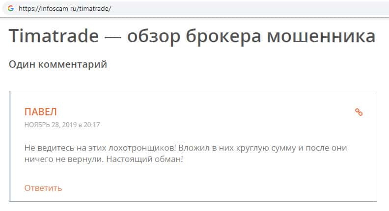 На веб-сайте infoscam ru обнаружен пользовательский отзыв некого Павла, который свидетельствует о том, что скам-брокер Тима Трейд не возвращает денежные средства своим клиентам. Все потому что реальной задачей мошеннической конторы TimaTrade является вытягивание из клиента как можно большие суммы денег.