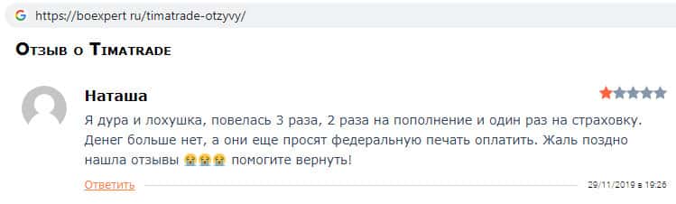 На веб-портале boexpert ru был найден отзыв о том, как пользователь некая Наташа два раза пополнила торговый счет по просьбе аферистов Тима Трейд, а так же один раз оплатила страховку. В итоге она осталась ни с чем. Учитесь на чужих ошибках и не связывайтесь с шарагой TimaTrade !!!
