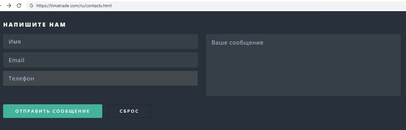 Скам-контора Тима Трейд на своем официальном сайте ведет сбор данных о клиенте, предоставляя бланк под предлогом якобы возможности обратной связи на их сайте, обещая после чего связаться с пользователем. Данный бланк для сбора данных о пользователях не такой уж и безобидный, как кажется на первый взгляд.