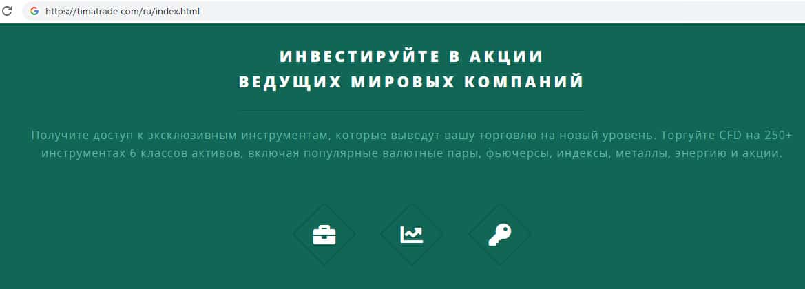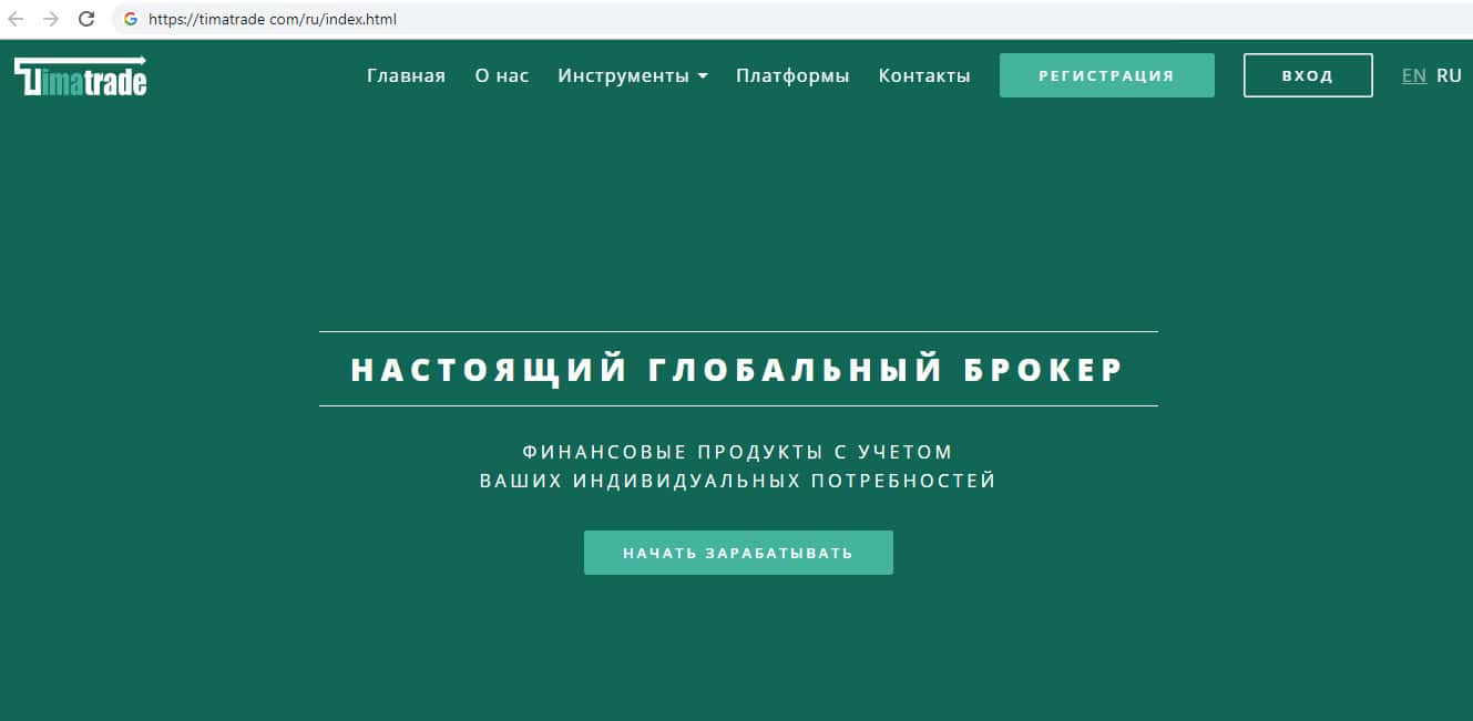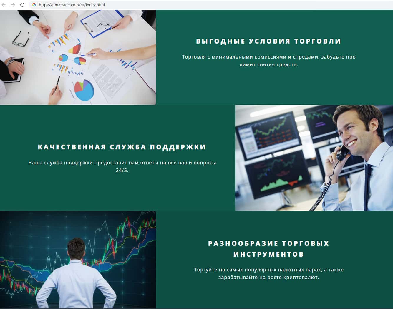 Скам-организация TimaTrade предлагает инвестиционные, а так же брокерские услуги на их сайте претворяясь брокером международного уровня. Жулики Тима Трейд врут о том, что предоставляют доступ к эксклюзивным торговым инструментам и активам. На самом деле их сайт ничем не отличается от стандартных мошеннических сайтов.