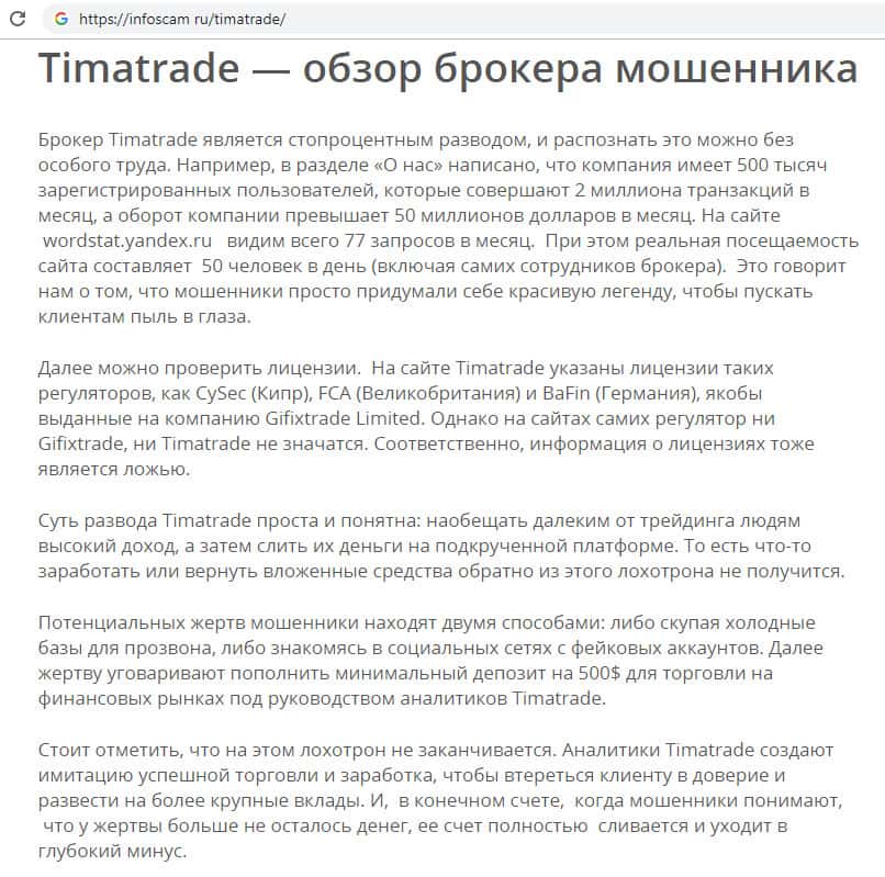 На сайте infoscam ru найдена статья о мошенничестве TimaTrade. Данный скам-брокер скрывает информацию о себе, претворяясь честным брокером. Вместо лицензии жулики Тима Трейд предоставляет наивному пользователю регистрационный номер их организации, надеясь на то, что невнимательные пользователи не заметят этого.