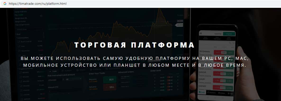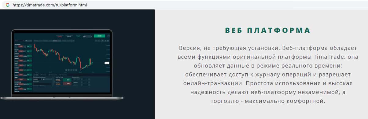 Торговая платформа скам-конторы TimaTrade стандартная, такая же как предоставляют своим клиентам большинство брокерских контор. Мошенники Тима Трейд предлагают пользоваться веб-версией торговой платформы не скачивая для этого специальное приложение, то есть с помощью стандартного браузера, который установлен на компьютере.С помощью веб-версии торговой платформы жулики Тима Трейд отслеживают местонахождение пользователя, а так же все данные о компьютере пользователя, включая информацию об ip-адресе клиента, и конечно же с какого браузера ведется торговля на сайте. Ни в коем случае не начинайте торговать на фальшивом сайте скам-брокера TimaTrade !!!