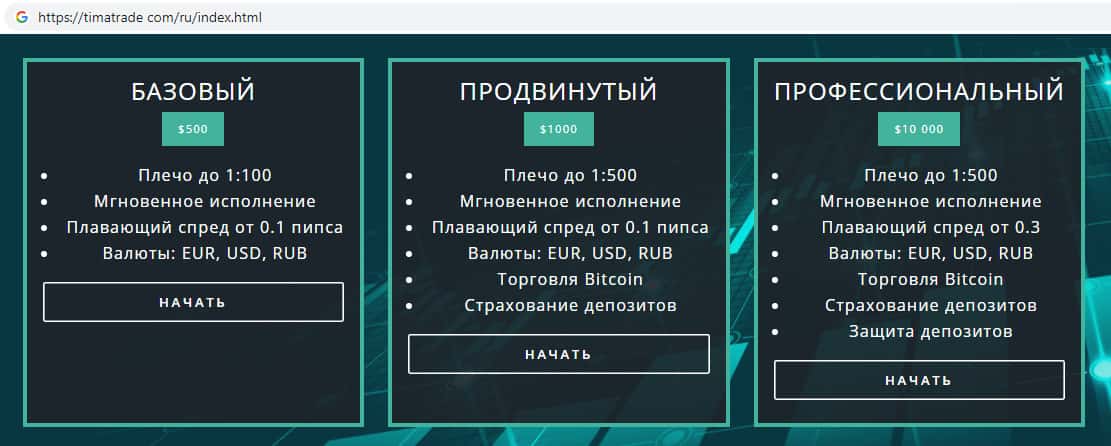 Какой бы тип торгового счета Вы ни выбрали, мошенники TimaTrade не будут относиться к Вам как к особенному клиенту. Сайт аферистов Тима Трейд рассчитан на тех людей, которые будут вкладывать как можно больше денежных средств. На какую-либо прибыль на данном сайте рассчитывать не стоит !!!
