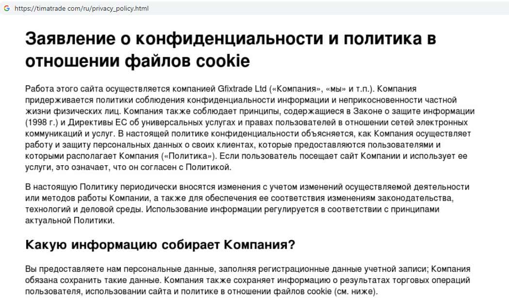 Мошенники Тима Трейд на своем официальном сайте оставили пользователю всю необходимую информацию об условиях пользования сайтом и предлагаемой торговой платформой. Доступ к их сайту клиентам предоставляется на временной основе. Жулики TimaTrade вправе изменять условия сайта не предупреждая об этом клиента.Политика конфиденциальности мошеннической организации Тима Трейд