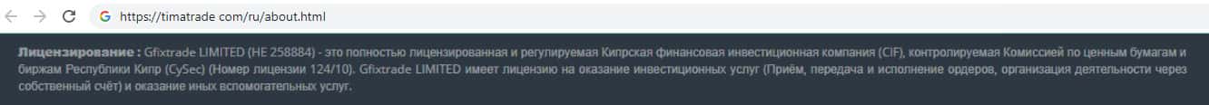 Мошенники TimaTrade не предоставили на своем официальном сайте лицензии. Согласно информации найденной на сайте жульнической организации, контора Тима Трейд имеет оффшорное место регистрации а именно зарегистрирована на Кипре, что является показателем того, что компания не подходит для граждан РФ.