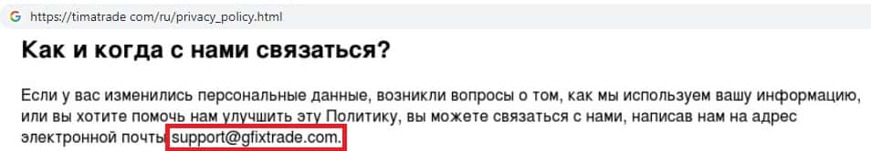 Жульническая контора TimaTrade для связи на своем официальном сайте не указала номера контактного телефона своей организации, зато аферисты указывают адрес электронной почты своей конторы, который указан ниже: