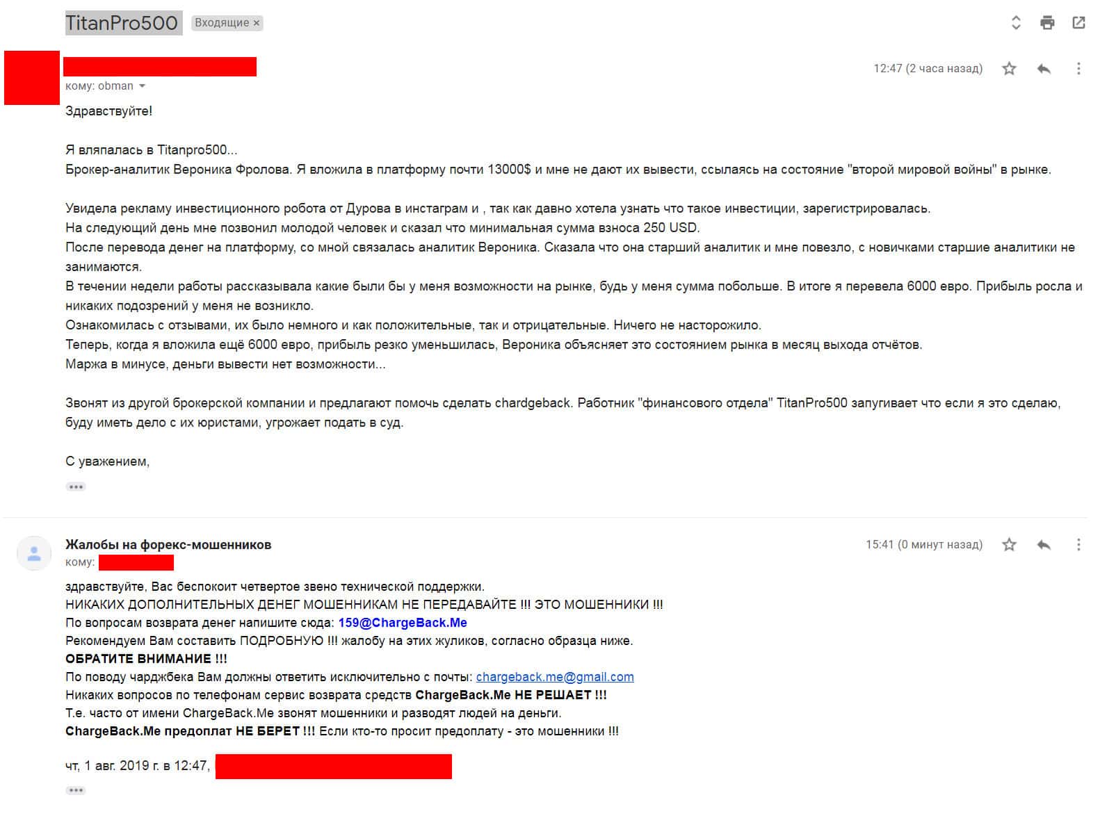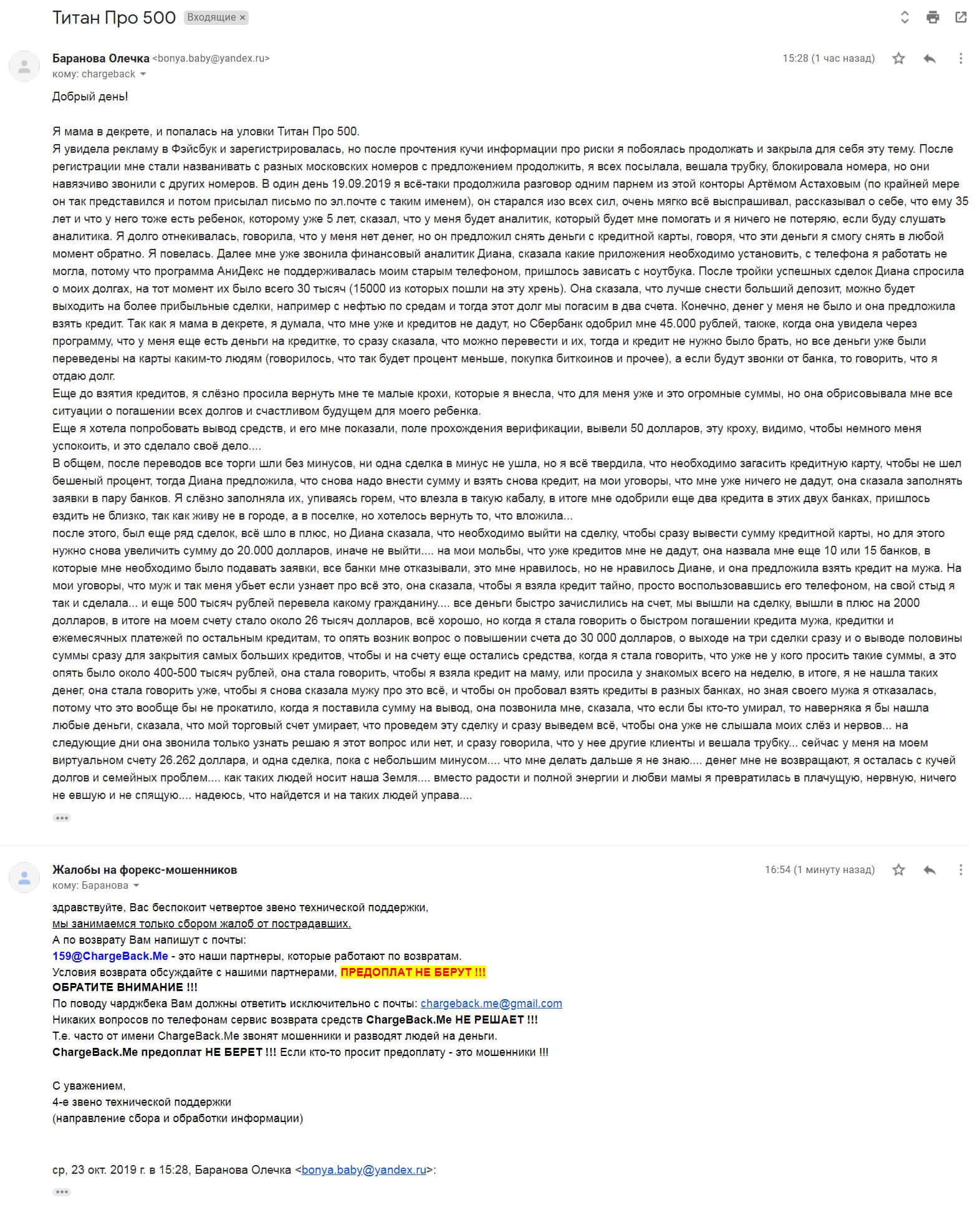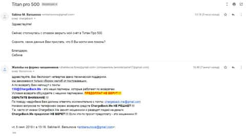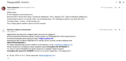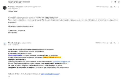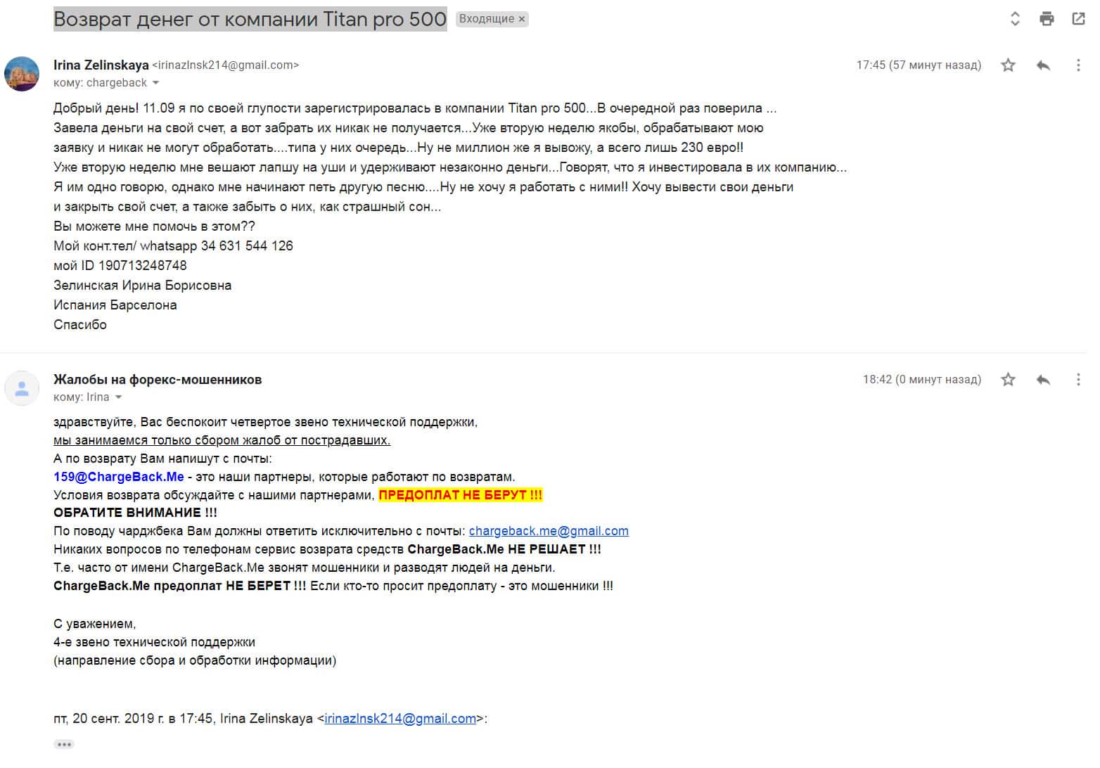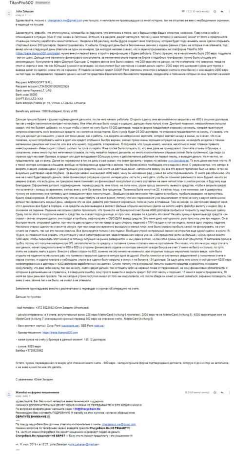 Девушка отправила письмо в компанию ChargeBack.Me чтобы довести, что шулера Титан Про 500 обворовали ее. Кухня втерлась в доверие к будущей жертве и под предлогом пробной инвестиции она вложила деньги. Жульбаны обещали, что можно будет вывести деньги в любое время, но вместо этого требуют еще.