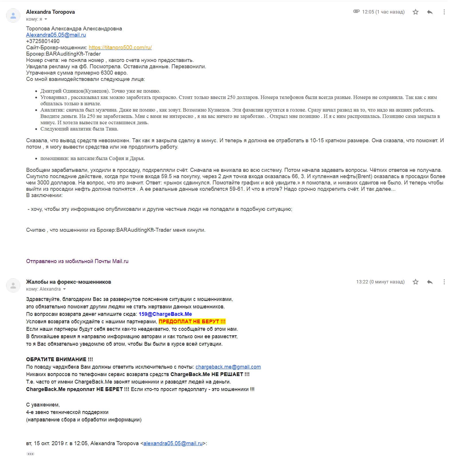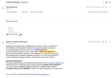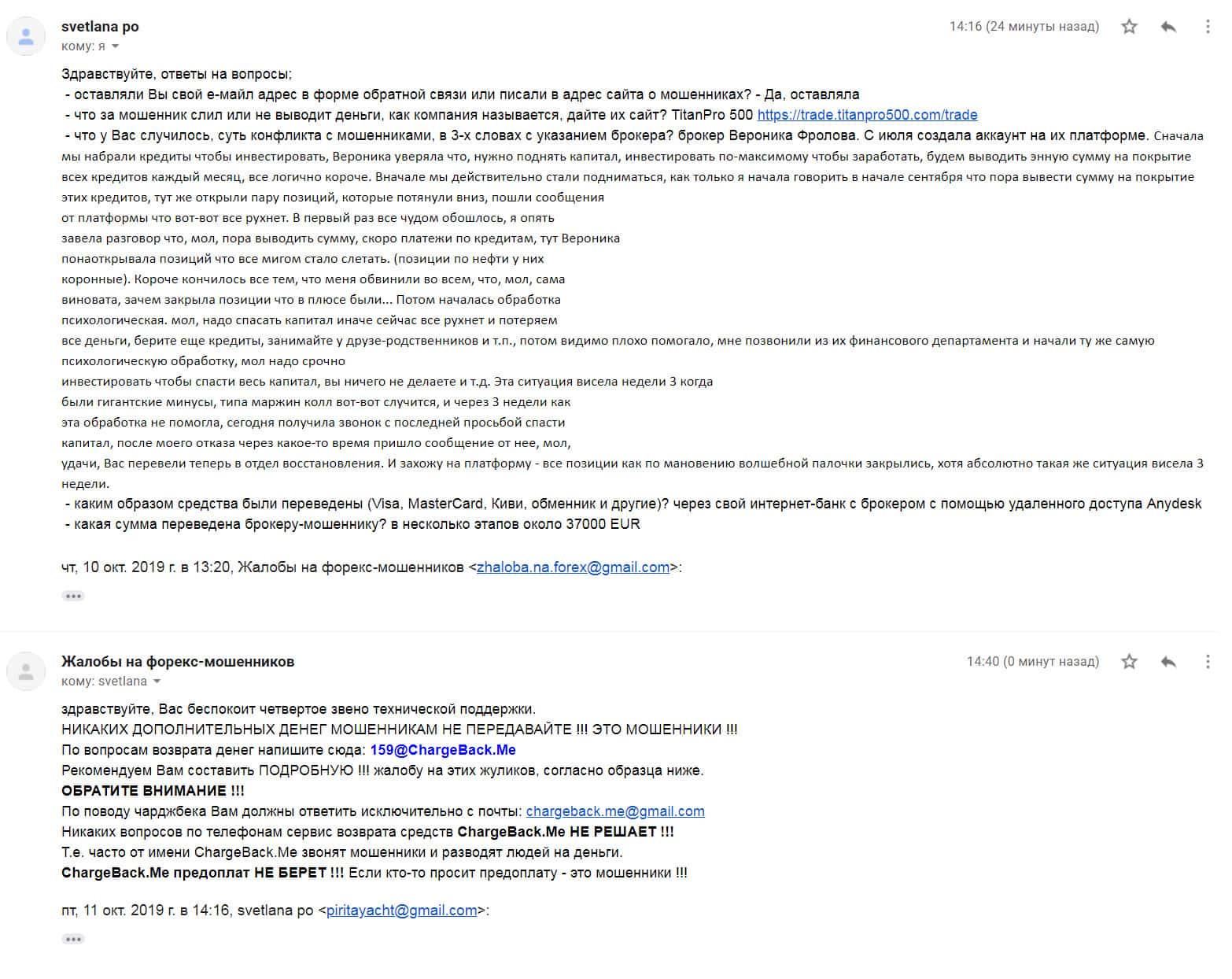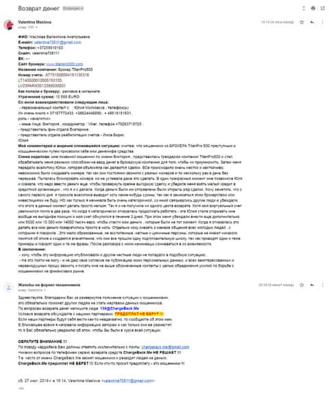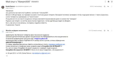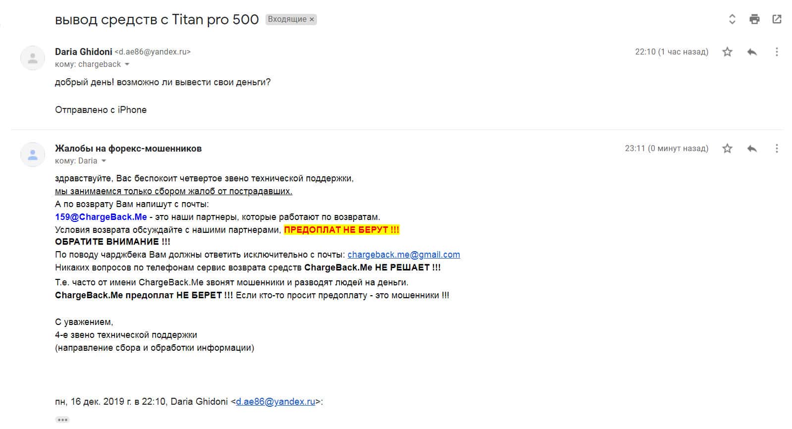 Девушка отправила письмо в компанию ChargeBack.Me чтобы довести, что шулера Титан Про 500 обворовали ее. Кухня втерлась в доверие к будущей жертве и под предлогом пробной инвестиции она вложила деньги. Жульбаны обещали, что можно будет вывести деньги в любое время, но вместо этого требуют еще.