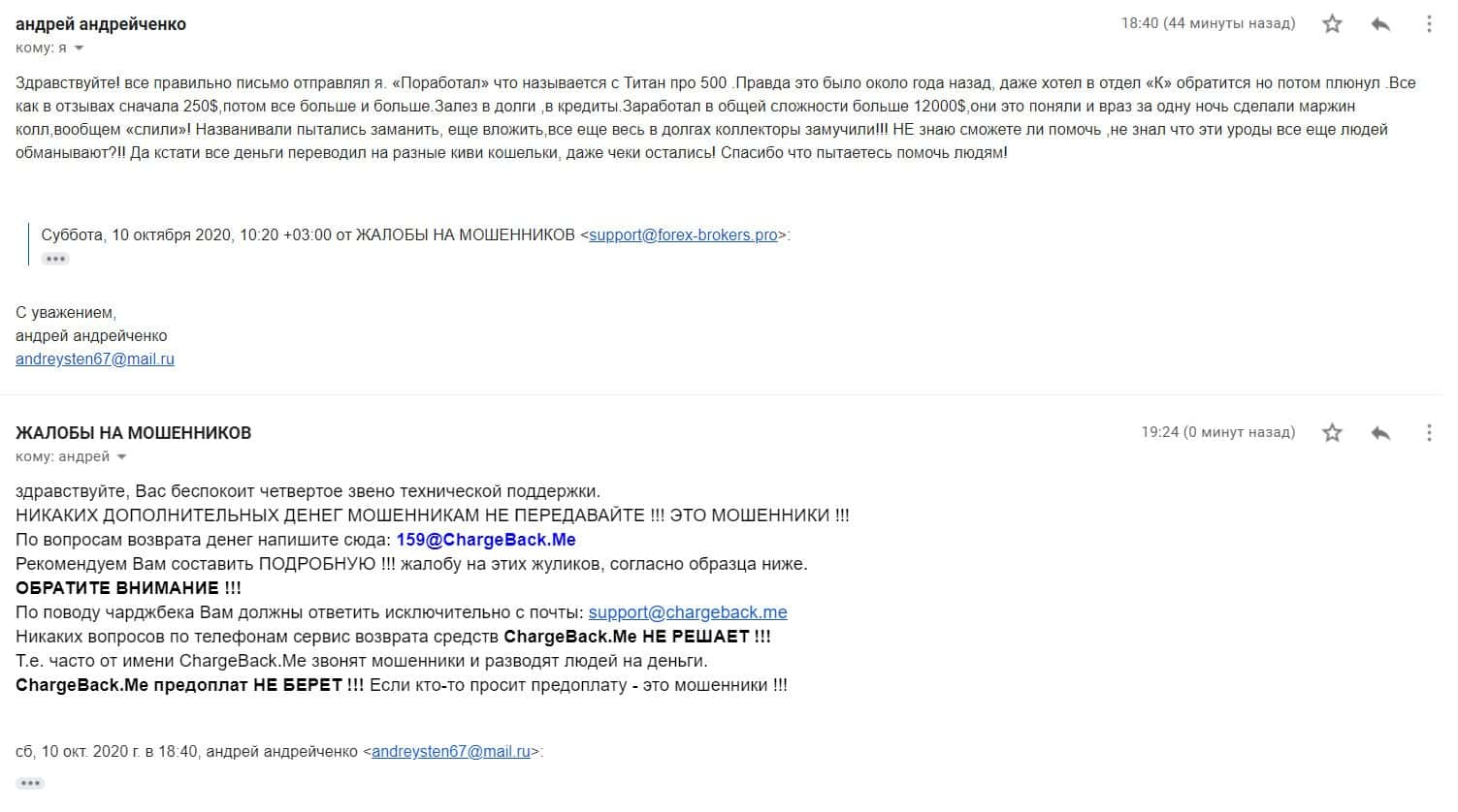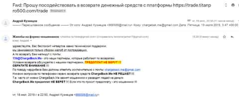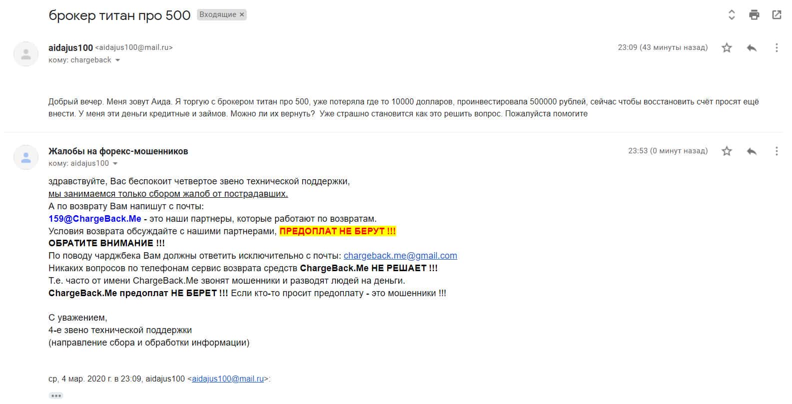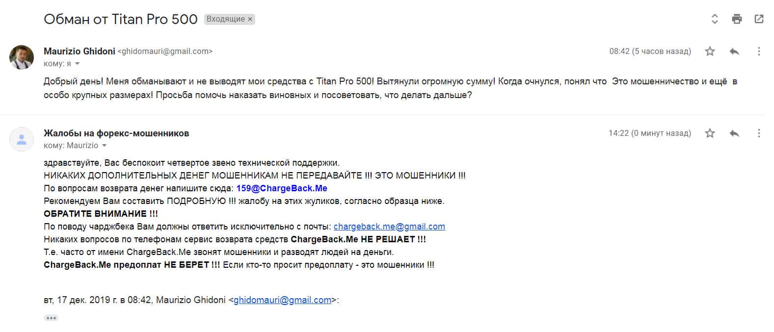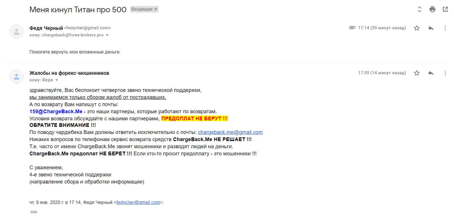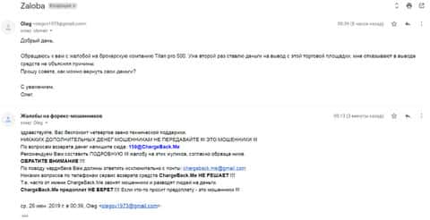 Автор последующего информационного материала в виде жалобы на шарлатанов Титан Про 500 ведает о том, что он нуждается в помощи по возврату потерянных денежных средств. На сайте по сбору жалоба на брокеров-аферистов Форекс, ему советуют обращаться в ChargeBack.Me