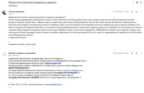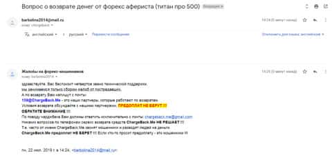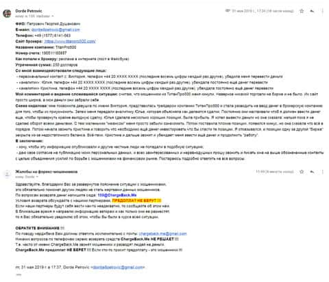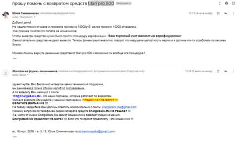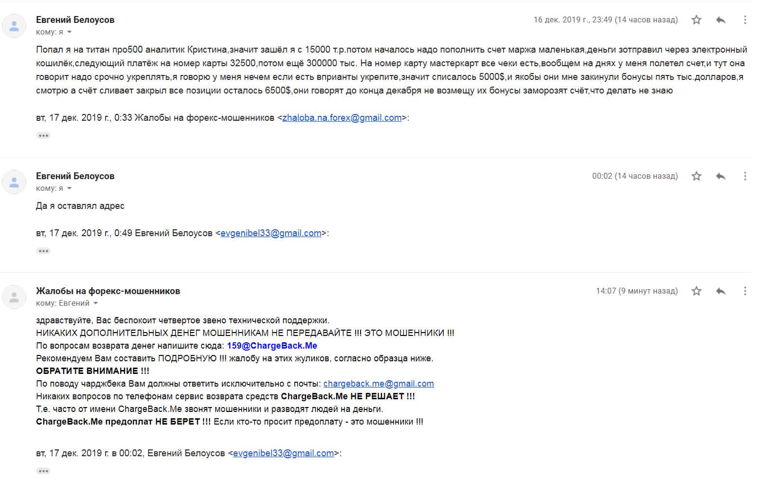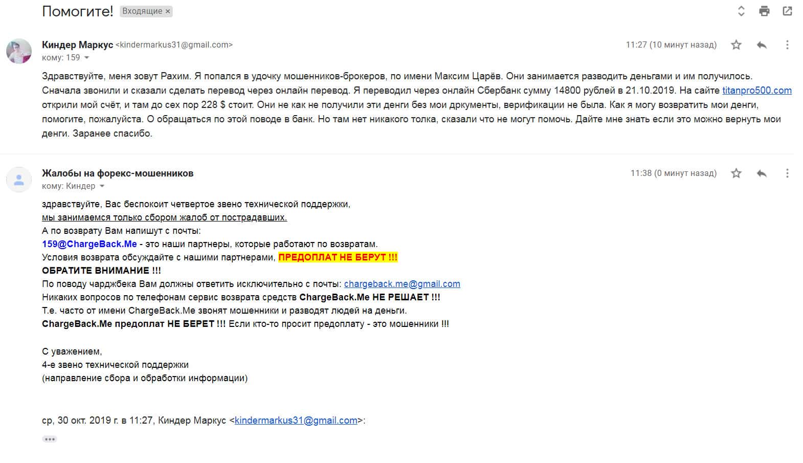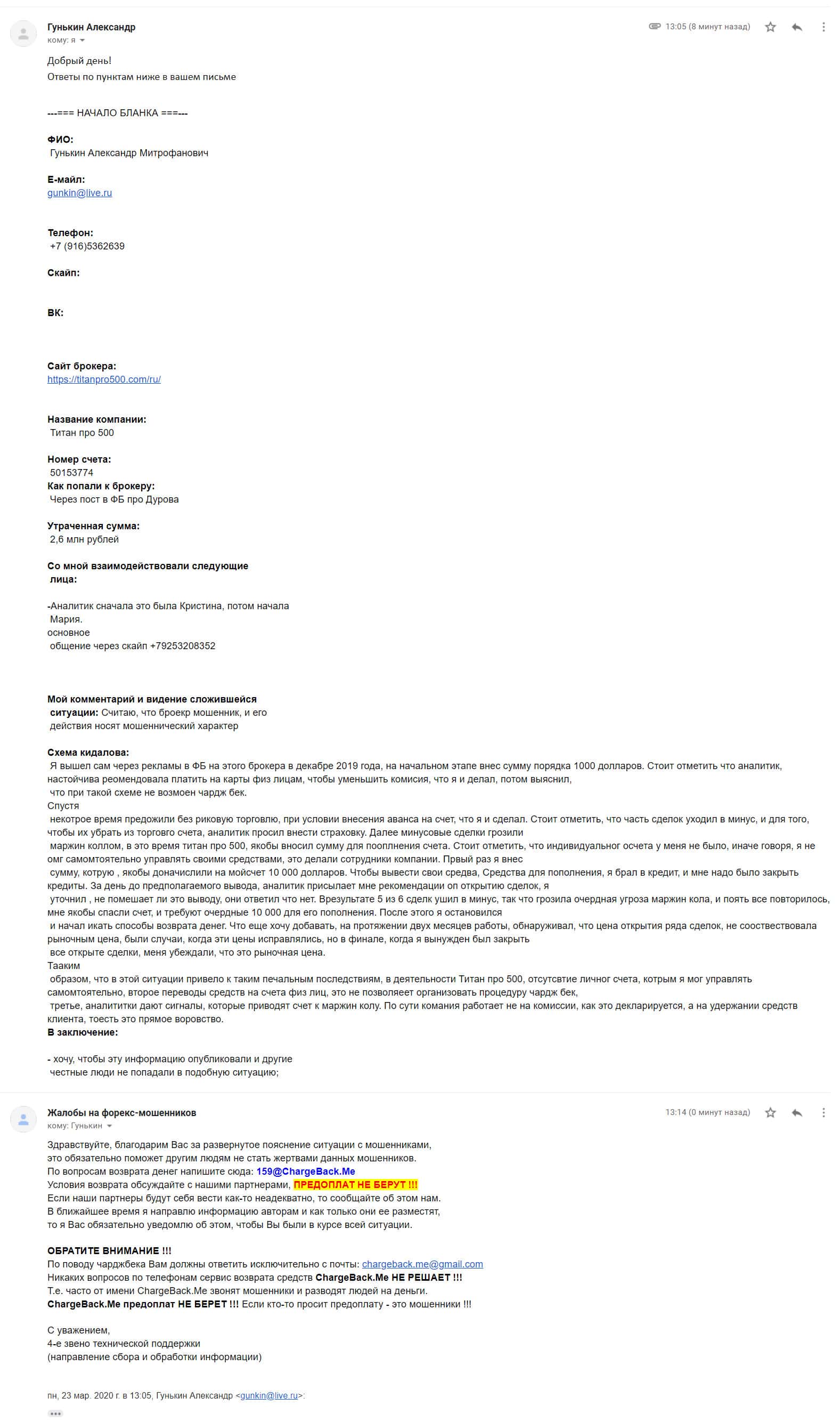 Автор последующего информационного материала в виде жалобы на шарлатанов Титан Про 500 ведает о том, что он нуждается в помощи по возврату потерянных денежных средств. На сайте по сбору жалоба на брокеров-аферистов Форекс, ему советуют обращаться в ChargeBack.Me