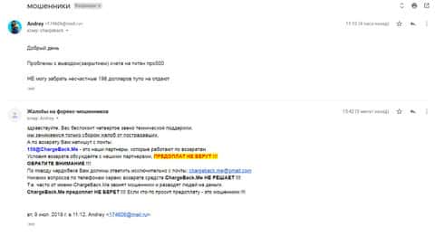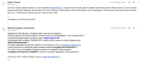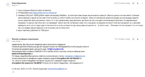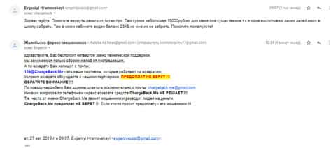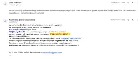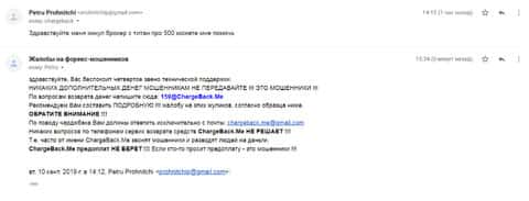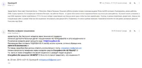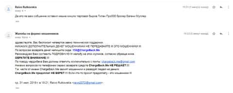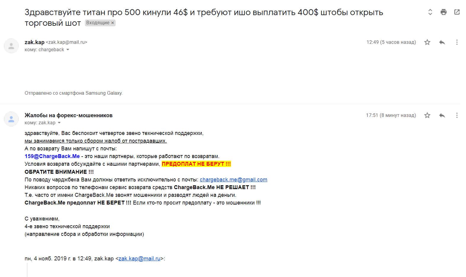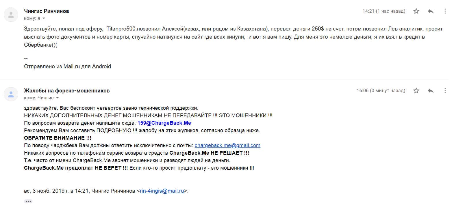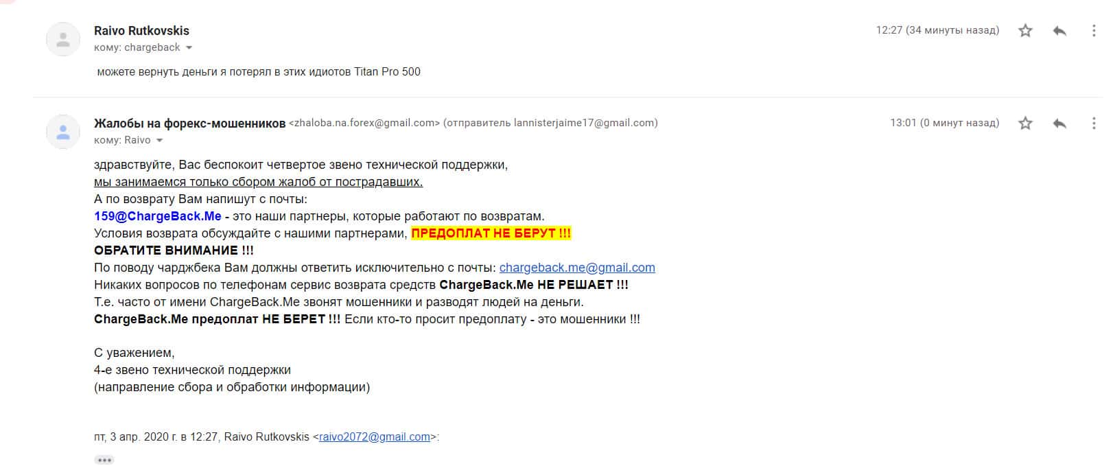 Человек также обратилась в компанию по возврату средств из форекс-кухонь под названием ChargeBack.Me с коротким письмом, где указал информацию о факте развода со стороны жуликов их кухни Titan Pro 500. Форекс-мошенники выдумают разную чушь, лишь бы не отдавать украденное.