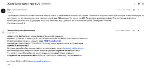 Далее представлено письмо, в котором опрокинутая женщина прикрепила развернутую жалобу на мошенников Titan Pro 500.