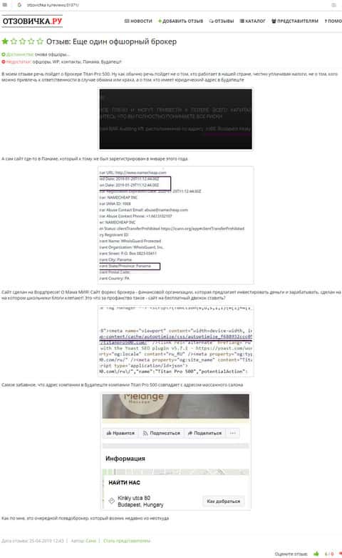 Человек, который написал следующий отзыв, достаточно хорошо разбирается во всех уловках форекс-мошенников и таким образом раскрыл оффшорное нутро кухни Titan Pro 500. По его словам, жулики указали свой адрес в Венгрии, а на самом деле их сайт зарегистрирован на Панаме.