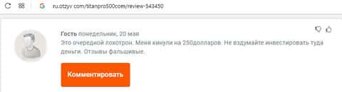 - Еще одного клиента жулики Titan Pro 500 кинули на 250 долларов