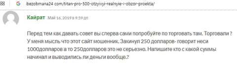 Вот один из отзывов, который раскрывает суть лохотрона Titan Pro 500. Человек закинул на счет, открытый там, 250 долларов и ему аналитики пообещали что будут помогать в торговле. Но вместо помощи он получает телефонные звонки, где жулики требуют вложить еще 1000 долларов США.