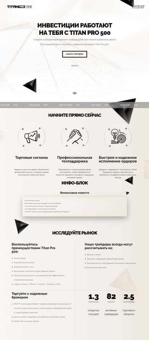 По поводу сайта лохотрона Титан про 500 здесь можно сказать, что дизайн достаточно неплохой и ненавязчивый. Но стоит прочитать контент, который находится на сайте, то сразу становится ясно, что это мошенники. Цифры открытых позиций, активных трейдеров и торгового оборота преувеличены в тысячи раз.