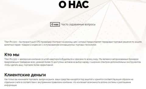 Что касается лицензии у форекс-брокера Титан Про 500, так здесь также нет никакой информации. В разделе "О нас" упоминается только то что это венгерская компания с главным офисом в Будапеште и офисами по всему миру и, так как это нерегулируемый брокер, то вся ее деятельность находится вне закона.