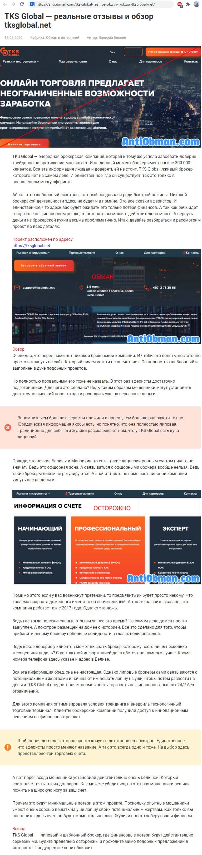 Специалисты аналитического ресурса antiobman com в своем обзоре критически отзываются о деятельности брокерской конторы TKSGlobal и не советуют ей доверять.