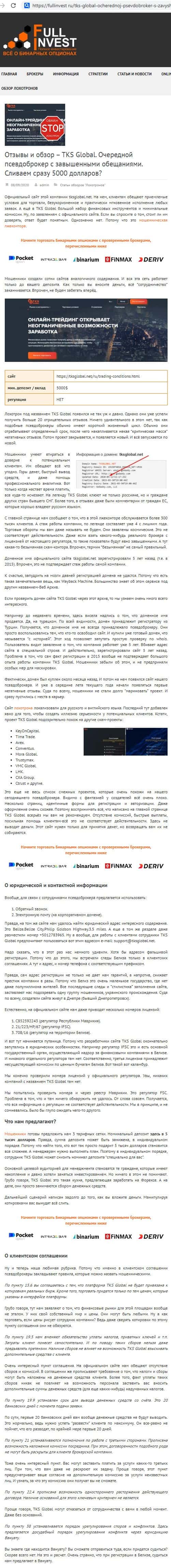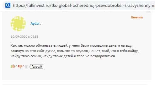 Отчаявшийся трейдер, у которого мошенники из компании TKSGlobal Net обманным путем украли все деньги, разместил негативный отзыв на веб-ресурсе fullinvest ru.