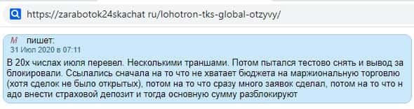 Обманутый трейдер в своем отзыве на сайте zarabotok24skachat ru рассказал о том, что при попытке вывести деньги из компании ТКС Глобал получил глобальный облом.
