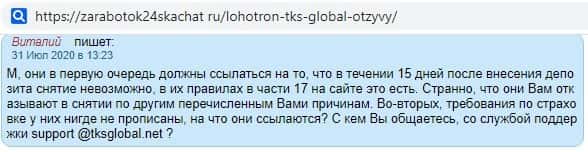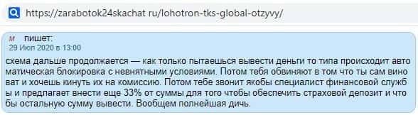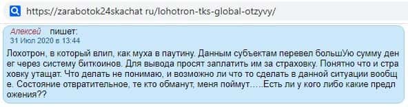 Обманутый клиент компании ТКС Глобал жалуется в своем отзыве на сайте zarabotok24skachat ru на то, что для вывода средств ему нужно внести еще страховой депозит.