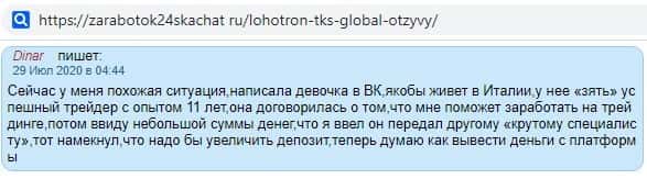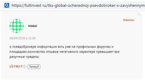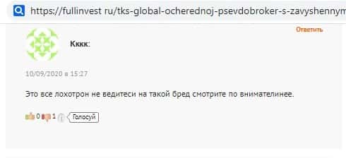 Обманутый трейдер в своем отзыве на информационном сайте fullinvest ru называет компанию ТКС Глобал лохотроном и советует не вестись на ее уловки.