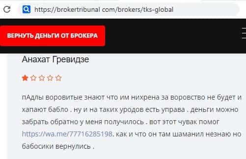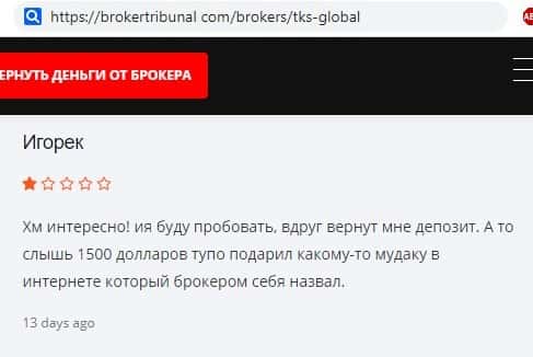 Обманутый клиент брокерской кухни ТКС Глобал, по примеру другого удачливого трейдера, хочет вернуть украденные у него этими жуликами 1500 долларов.